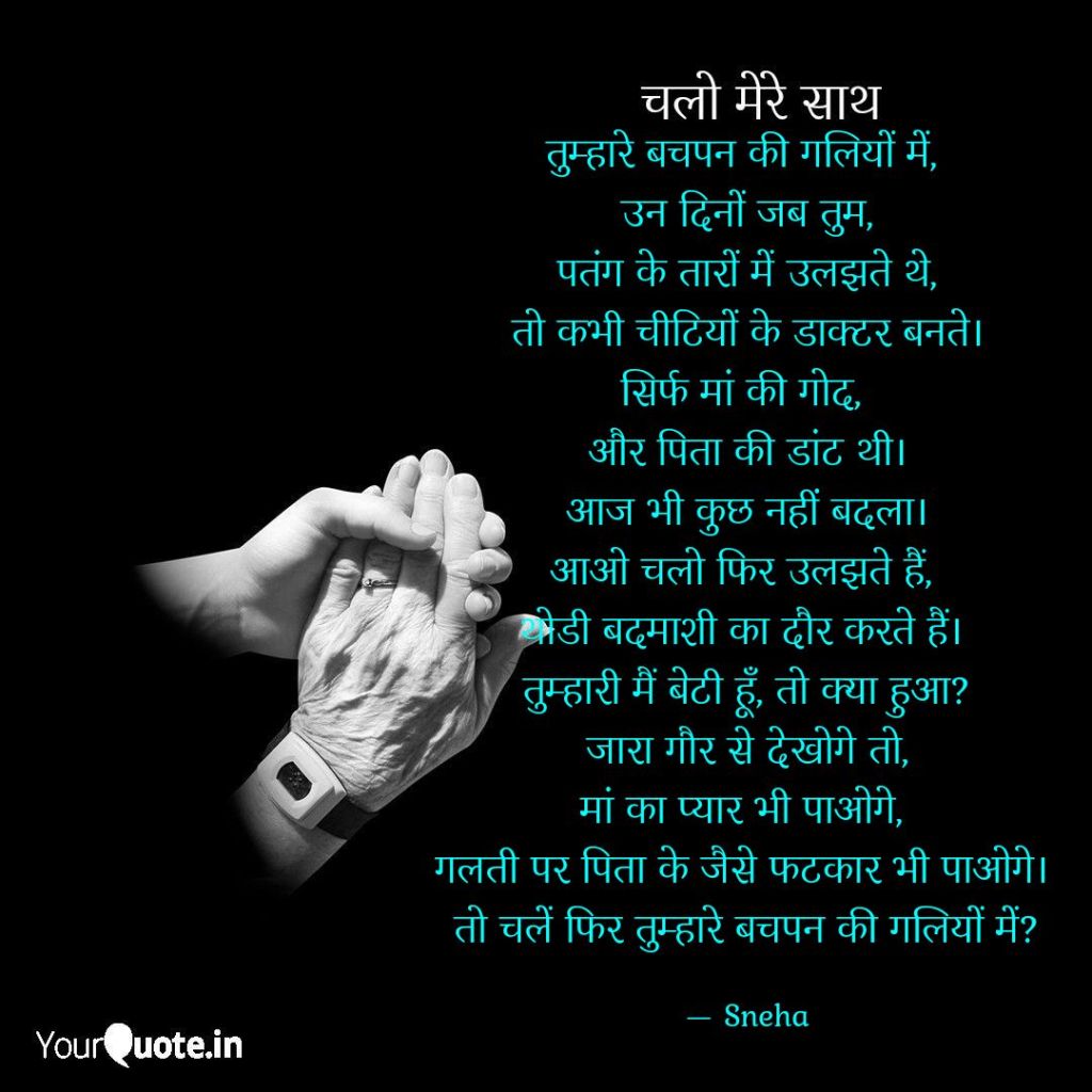 Come with me, Let's walk, Through the lanes of your childhood. Those days when you, Were busy in entangled kite and the wires, Sometimes as role playing of doctor of ants. No worries or no complexities. Only thing that was present, Was mother 's loving lap, And father's superficial scolding. Today also, nothing has changed. Come let's again get entangled, Let's do some rounds of naughtiness. So what, that I am your daughter? When you will look attentively, You will find mother 's love in me, And while doing mistake, You will get scolding like the father. So tell me, Should we again visit, through the lanes of your childhood?? Sneha